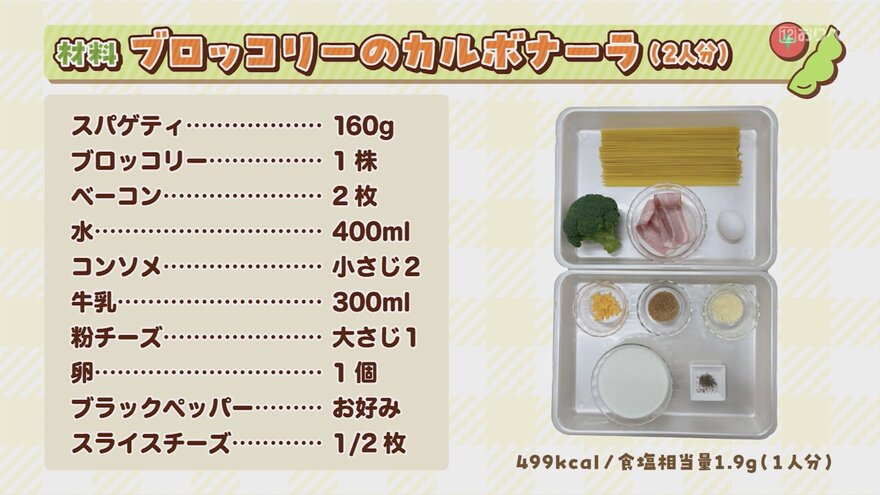 ベーコンを1cm幅に切る ブロッコリーの房は細かく刻み、芯は固いところを除き細かく切る