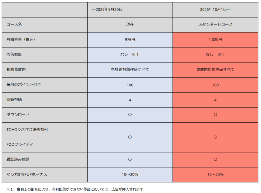 2025年10月1日から:FODプレミアム スタンダード:月額1,320円(税込)