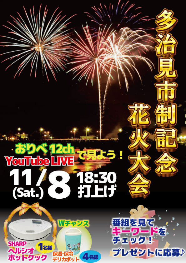 【11/8(土)生中継】多治見市制記念花火大会!★現在見逃し配信中★ 2025.11.08 お知らせ番組情報 今年は初の秋開催!「多治見市制記念花火大会」を生中継で放送! 11月8日(土)18:20~19:20 ※花火打ち上げは18:30~ 秋の夜空に打ちあがる花火をおりべ12chでご覧ください!番組を見てキーワードをチェック!プレゼントに応募しよう♪応募締切 :11月17日(月) 応募ページはこちらから! YouTubeライブにて見逃し配信中!誰でも!どこでも!見られる!! https://youtube.com/live/PjdHXwGzGNg