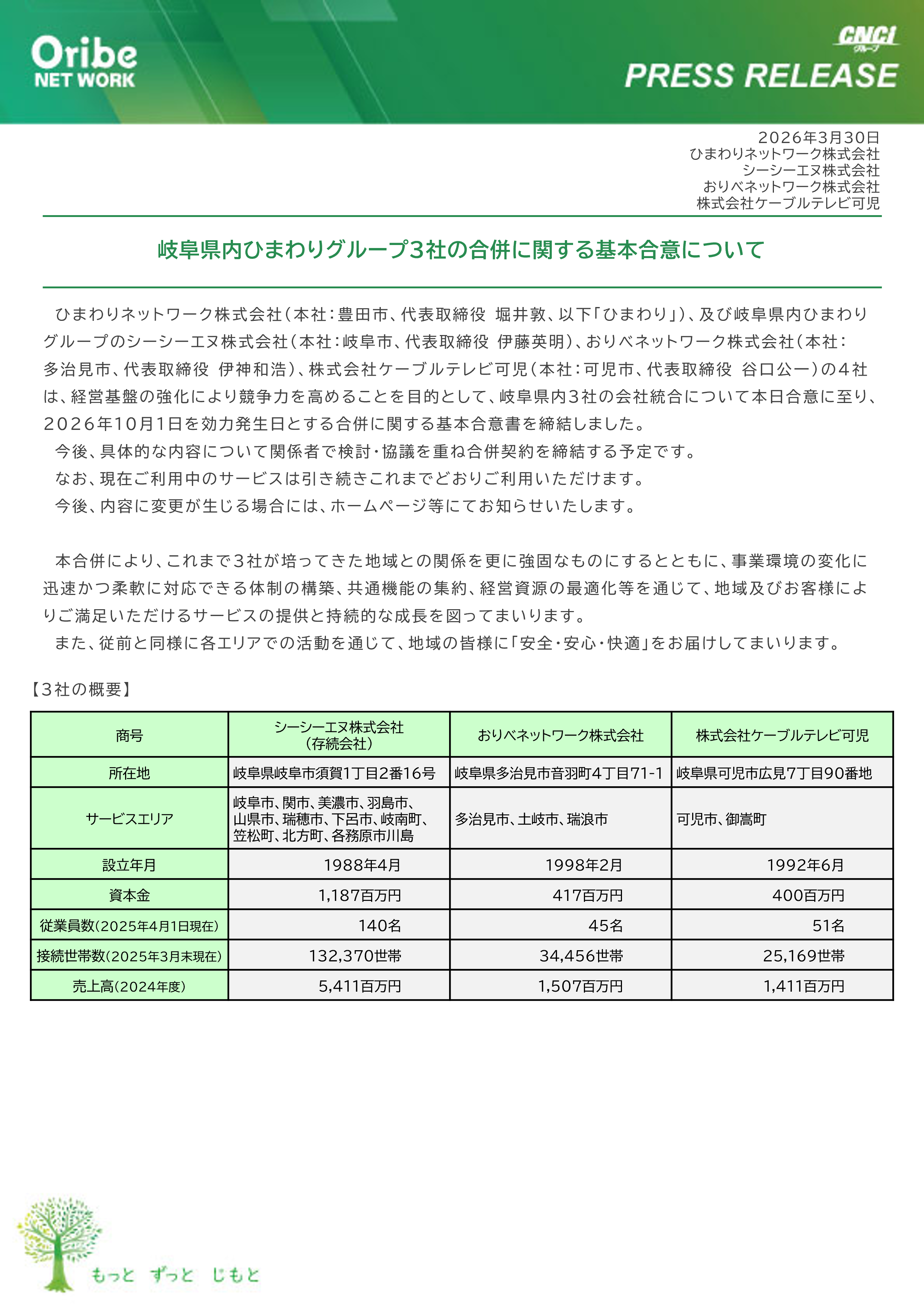 ひまわりネットワーク株式会社(本社:豊田市、代表取締役 堀井敦、以下「ひまわり」)、及び岐阜県内ひまわりグループのシーシーエヌ株式会社(本社:岐阜市、代表取締役 伊藤英明)、おりべネットワーク株式会社(本社:多治見市、代表取締役 伊神和浩)、株式会社ケーブルテレビ可児(本社:可児市、代表取締役 谷口公一)の4社は、経営基盤の強化により競争力を高めることを目的として、岐阜県内3社の会社統合について本日合意に至り、2026年10月1日を効力発生日とする合併に関する基本合意書を締結しました。