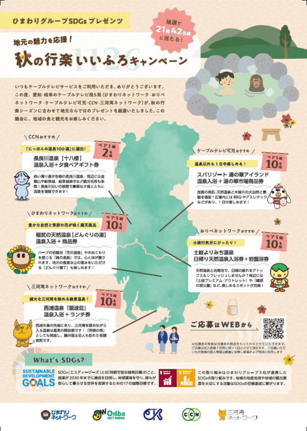 愛知・岐阜のケーブルテレビ局5局(ひまわりネットワーク・CCN・おりべネットワーク・ケーブルテレビ可児・三河湾ネットワーク)が秋の行楽シーズンに合わせて地元ならではのプレゼントを厳選致しました。この機会に地域の食と観光をお楽しみください。