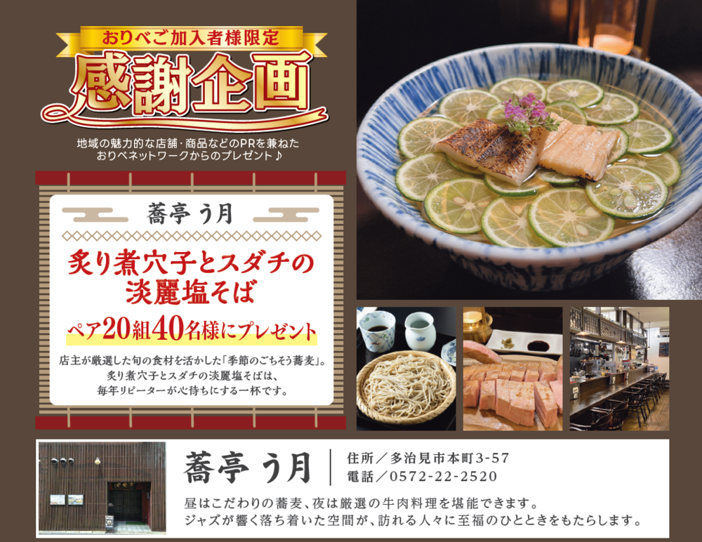 お客様感謝企画 「蕎亭 う月」で使える『炙り穴子とスダチの淡麗塩そば』を 20組40名様にプレゼント