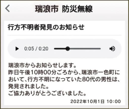 防災行政無線で放送された内容の内、市の情報提供サービスで配信メールされた情報を文字と音声でお知らせします。