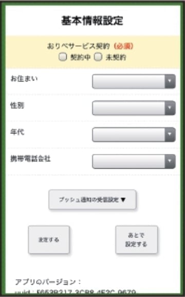 弊社サービスの契約者様は「契約中」を選択し、お住まい・性別・年代・携帯電話会社を選択し「プッシュ通知の受信設定」を押す