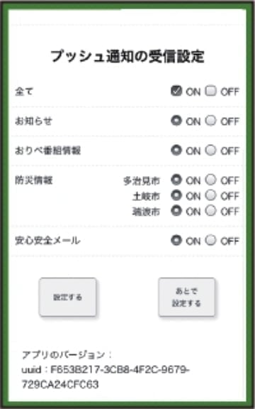 プッシュ通知で受信したい情報を選択し、画面下部の「設定する」を押す
