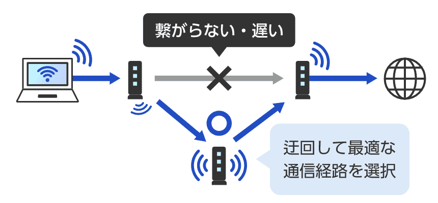 EasyMeshは最適な通信経路を自動で選択します。通信中の経路がつながらない・遅い状態になっても、より速くつながる経路を再選択して通信します。