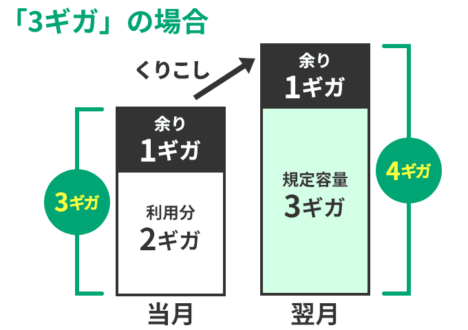 ※容量消費は、くりこし分+月間データ容量→追加購入データ容量の順番に行われます。くりこし上限は翌月に適応される料金プランの月間データ容量と同量までとなります。繰り越し容量は翌月までです。
